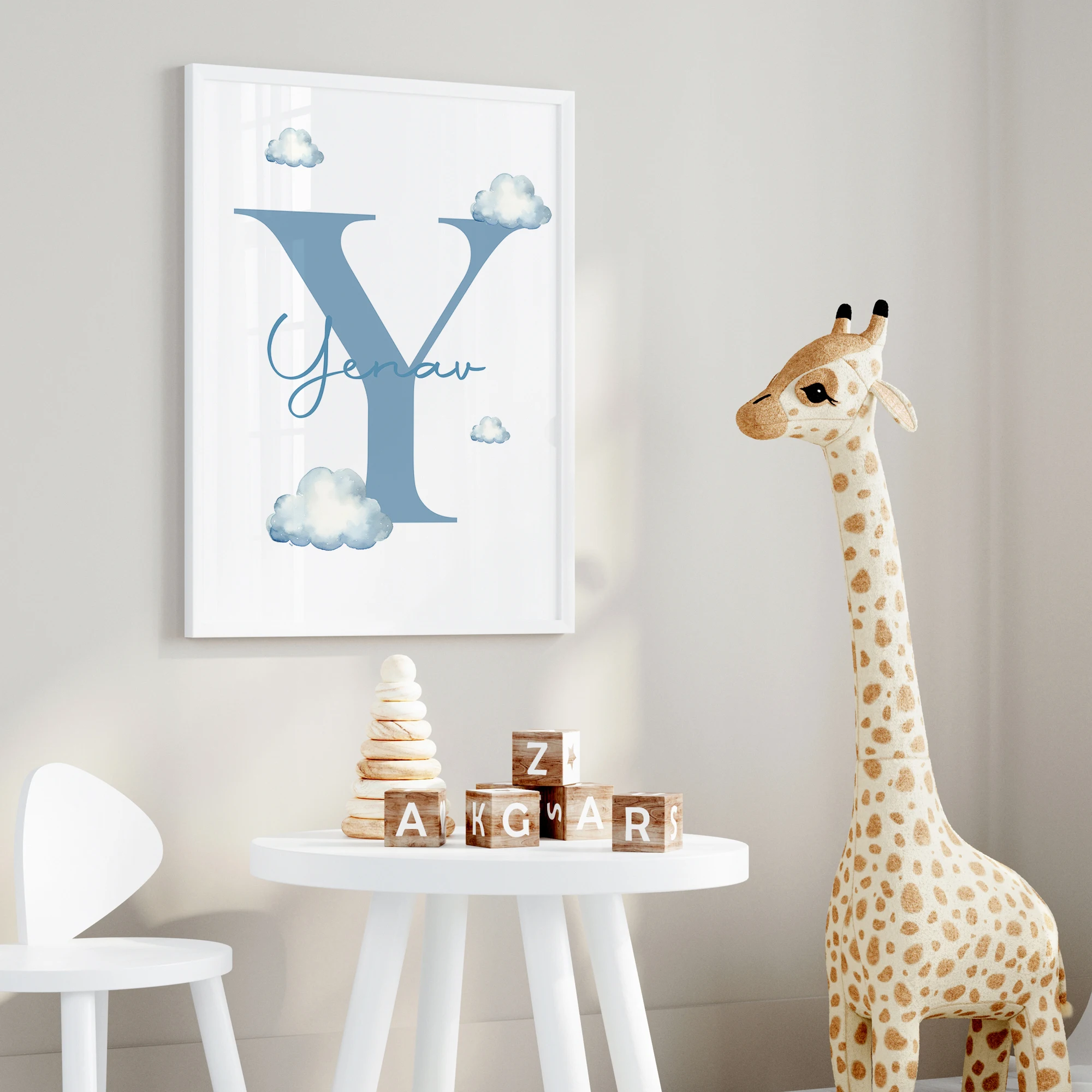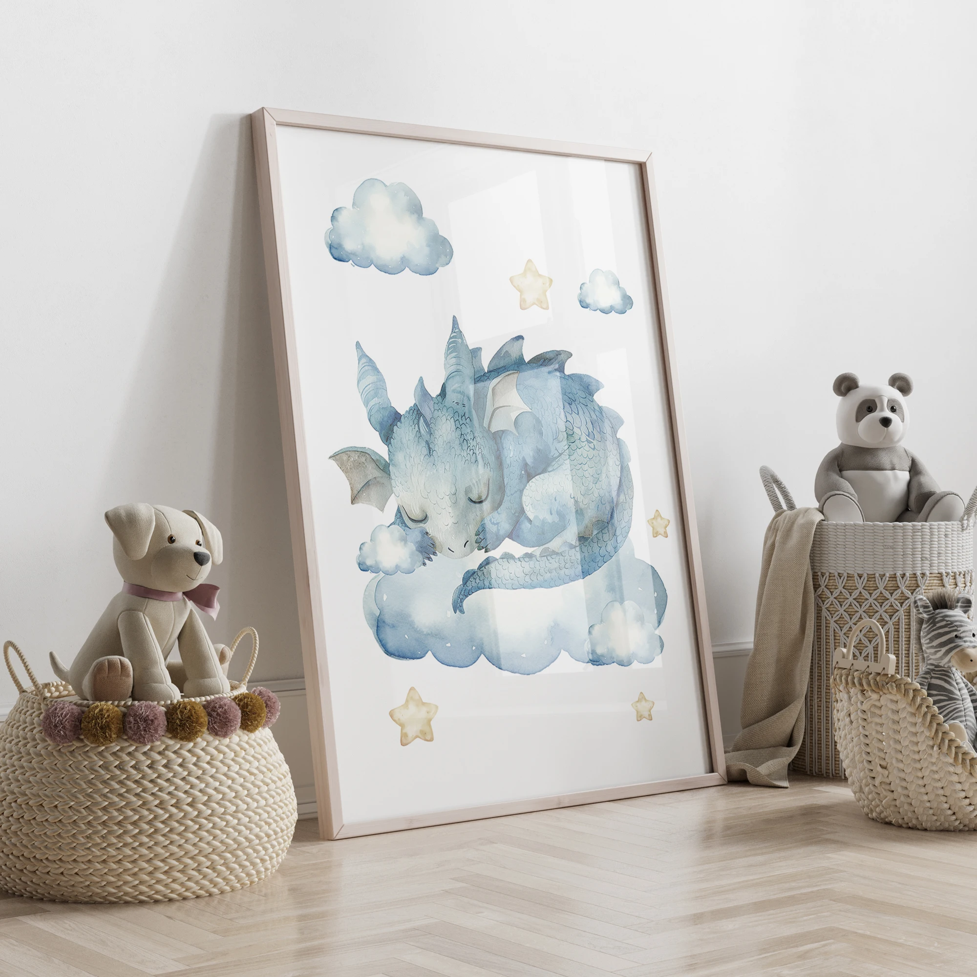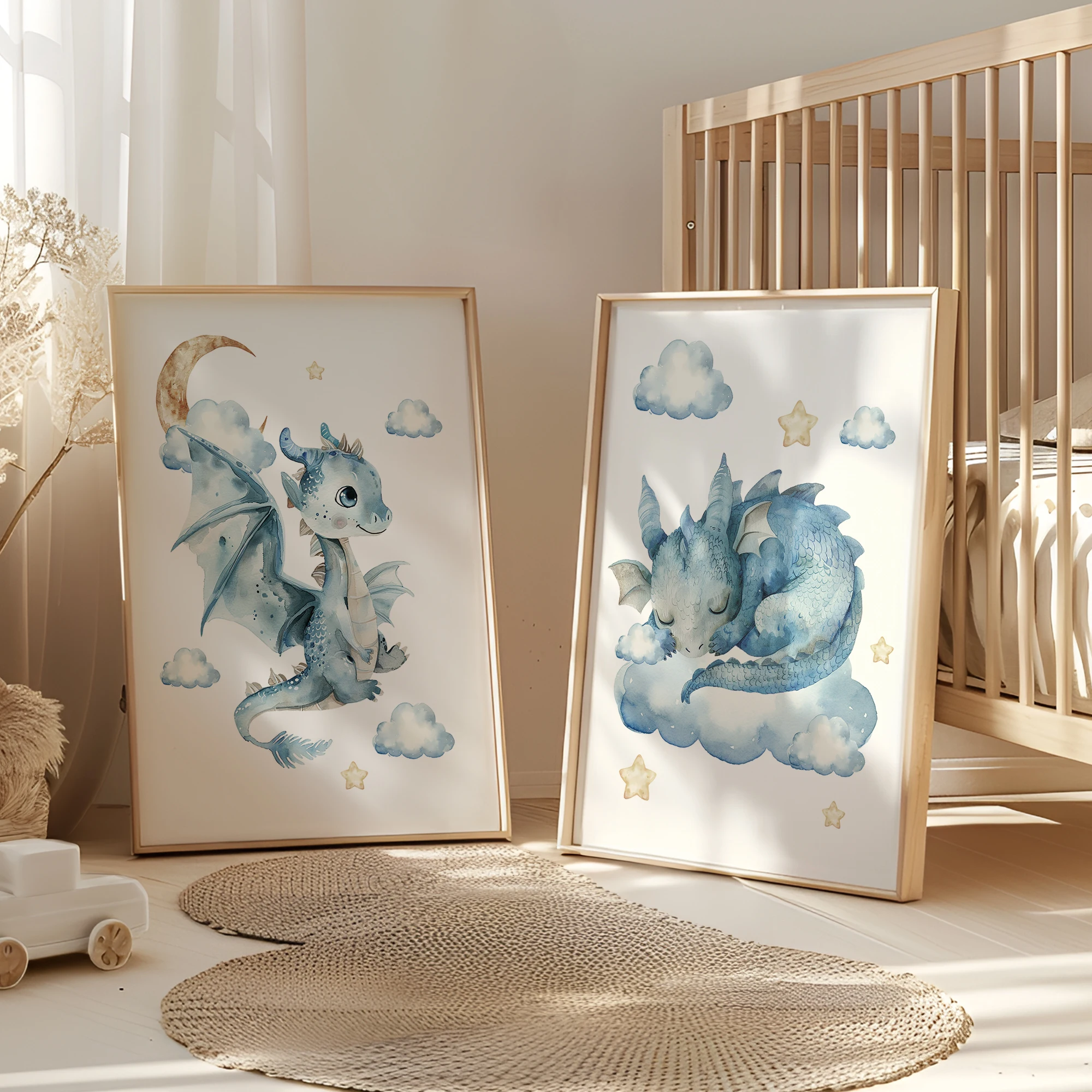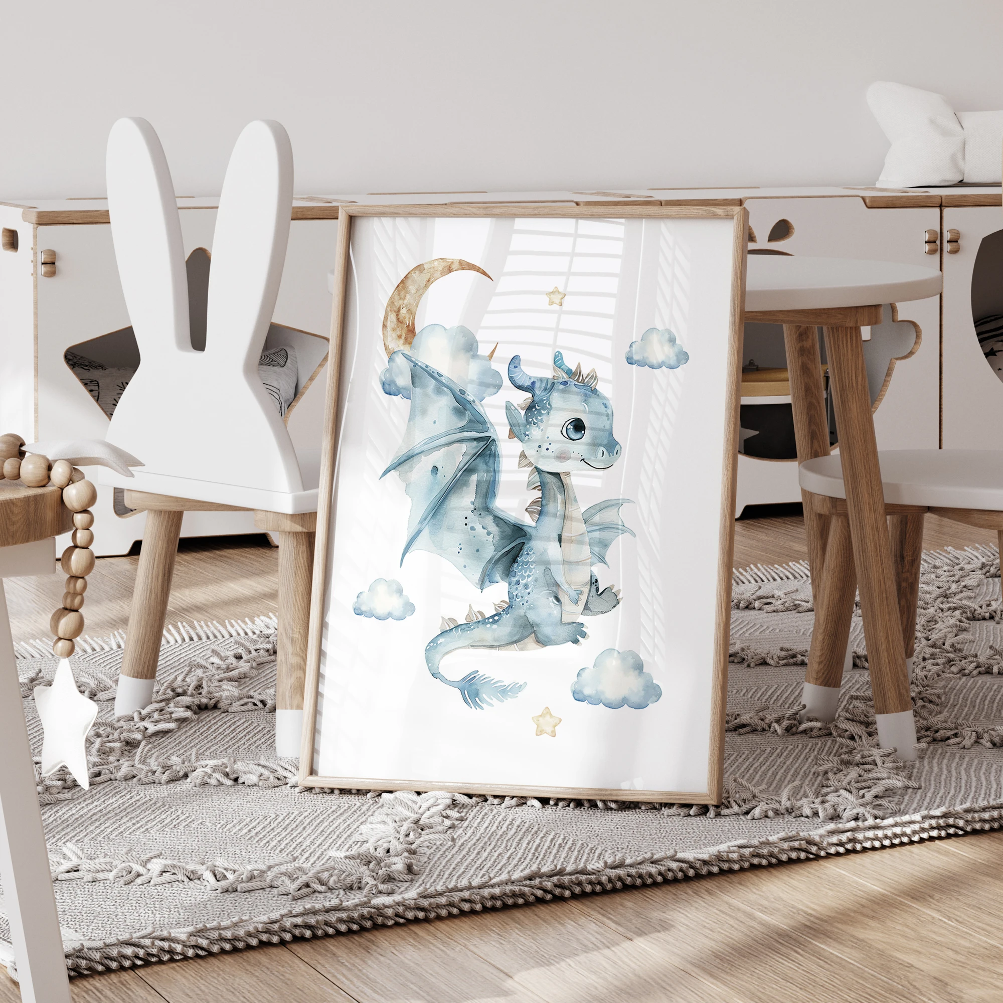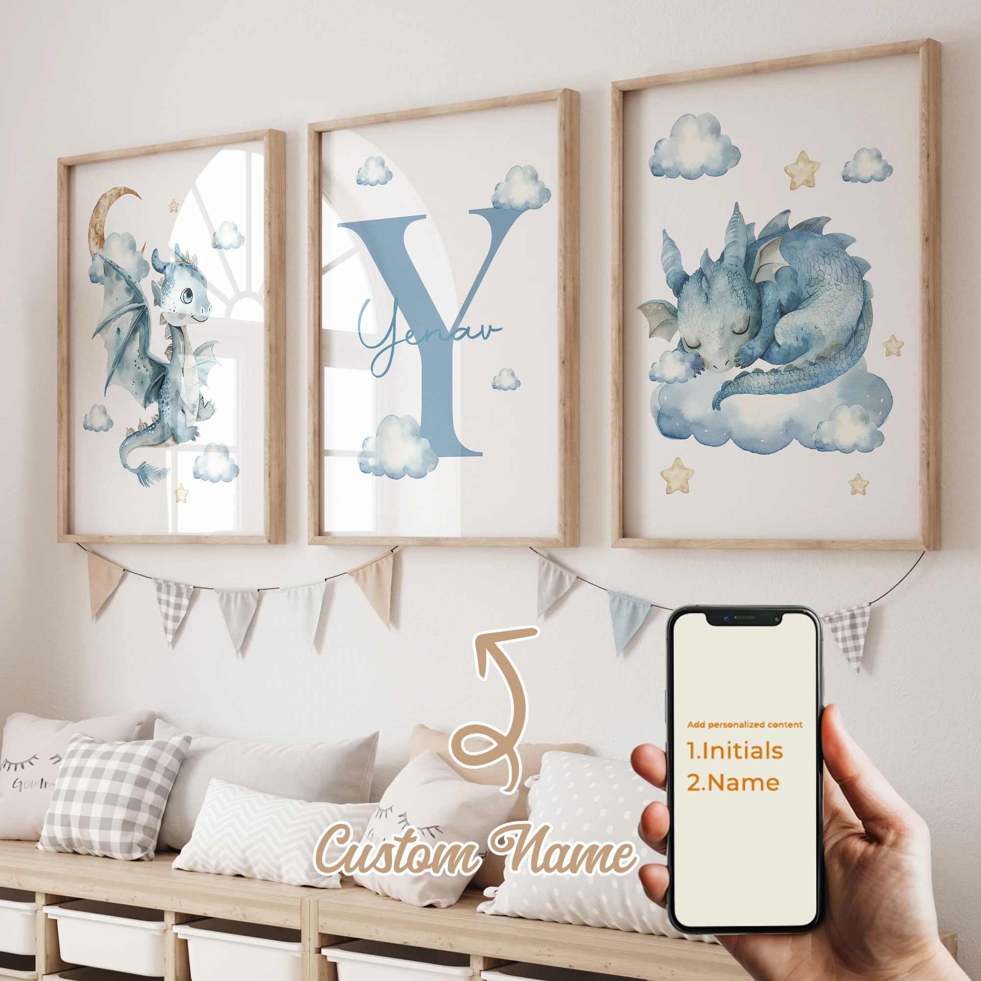 3pcs Custom Kids Personalized Name Dragon, Blue Boys Wall Art, Great for Baby Nursery/Kids Room