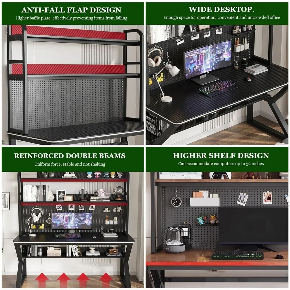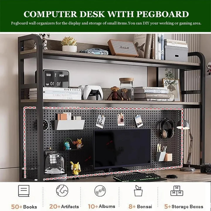 Perfect for maximizing space, the desk's open shelving and pegboard allow you to keep everything within reach while maintaining a clean, clutter-free area. Its versatile design suits a variety of needs, from organizing office materials to setting up the ultimate gaming station.