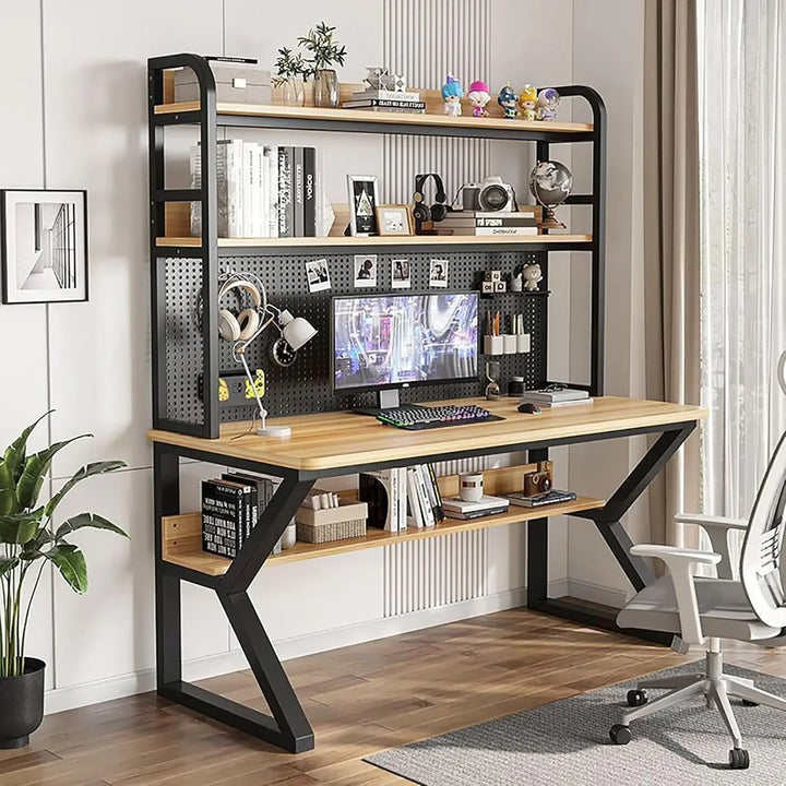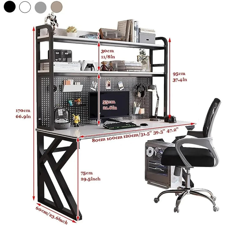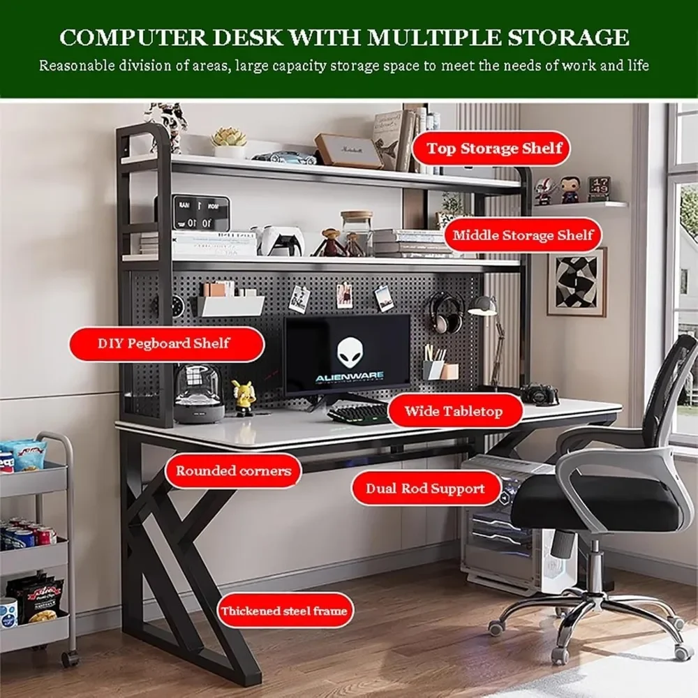 - 【Multifunctional Study Desk】It comes with a computer desk with Pegboard, a top hutch, and storage shelves to maximize study and work efficiency. It serves well as a wood and metal computer table, office workstation, study table, gaming desk with hutch or writing desk.