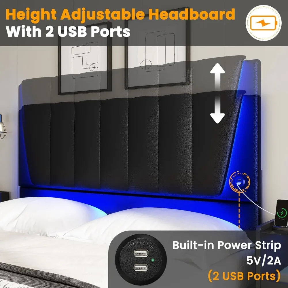 The adjustable LED headboard provides two height settings to accommodate mattresses between 10 to 13 inches, and it features two USB ports, allowing you to conveniently charge your phone, tablet, or computer while relaxing in bed. This bed frame combines style, practicality, and modern tech, making it a great choice for any bedroom.