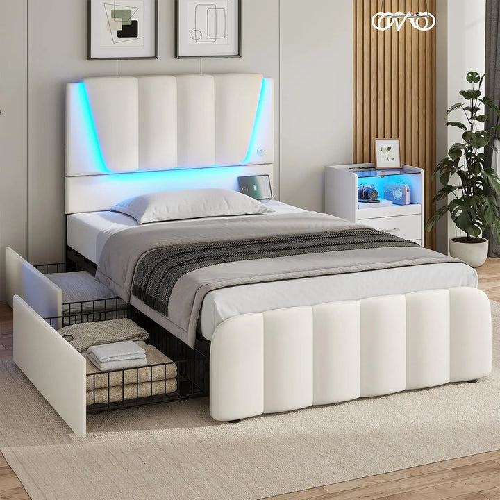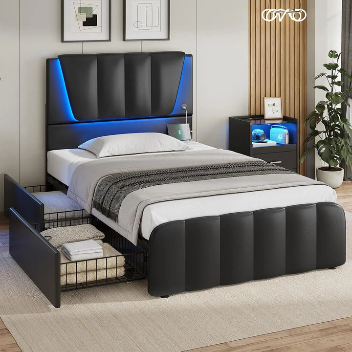 Queen Size Platform Bed Frame with Headboard and 4 Storage Drawers-Led Light & 2 USB Ports