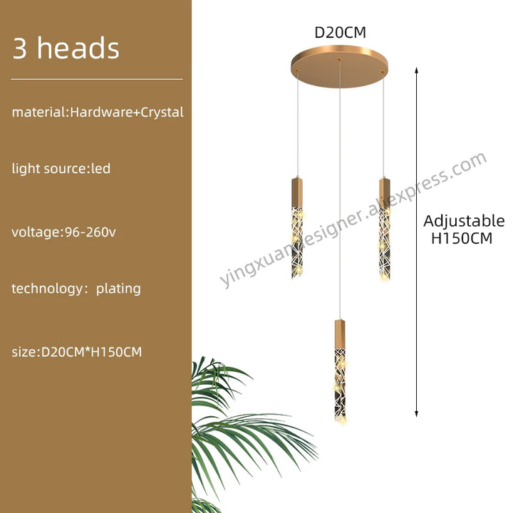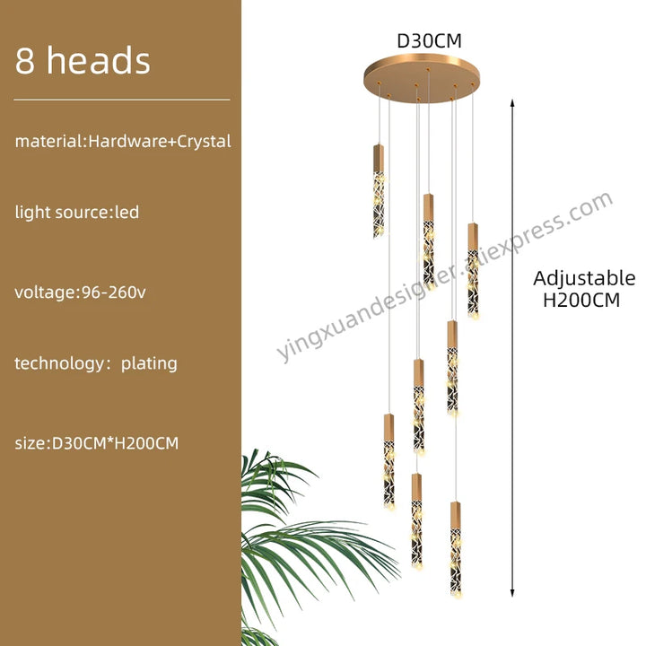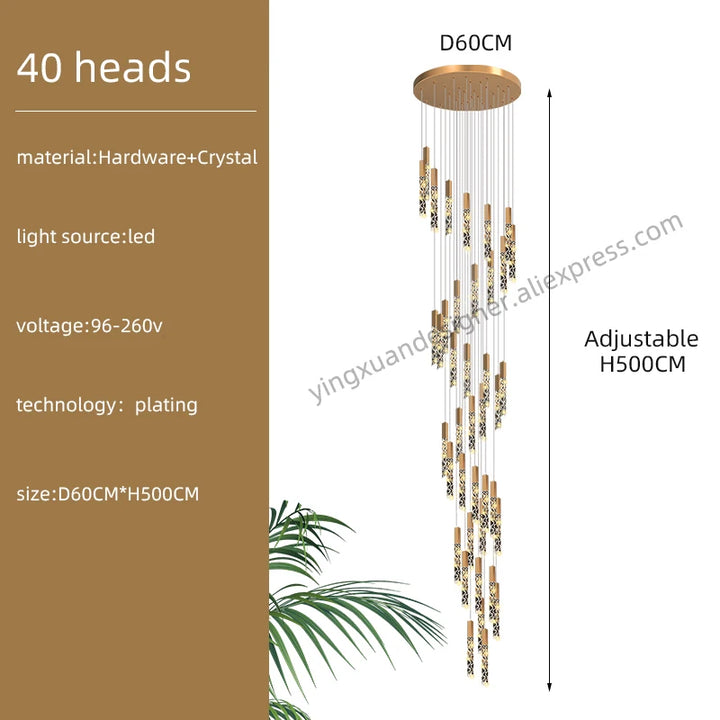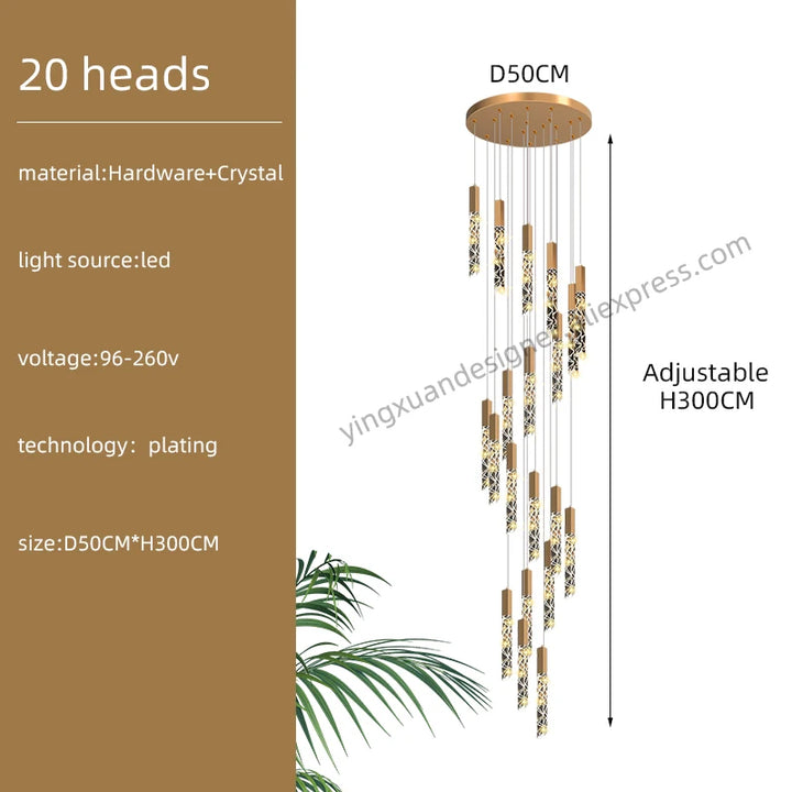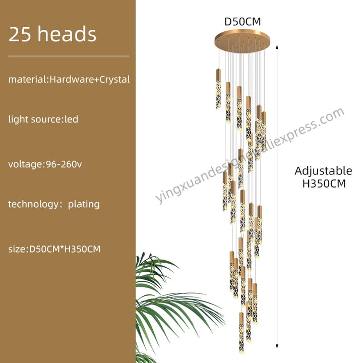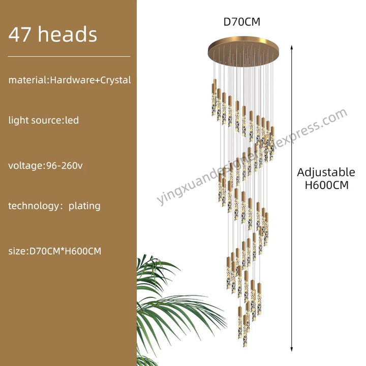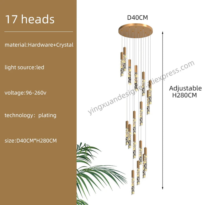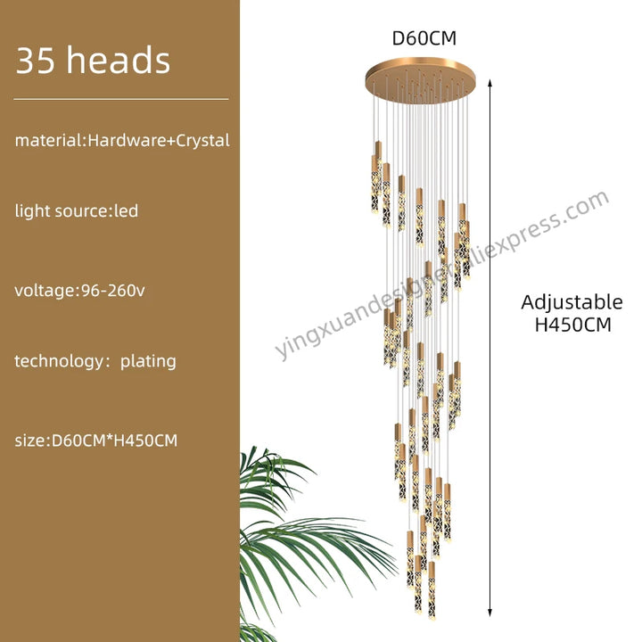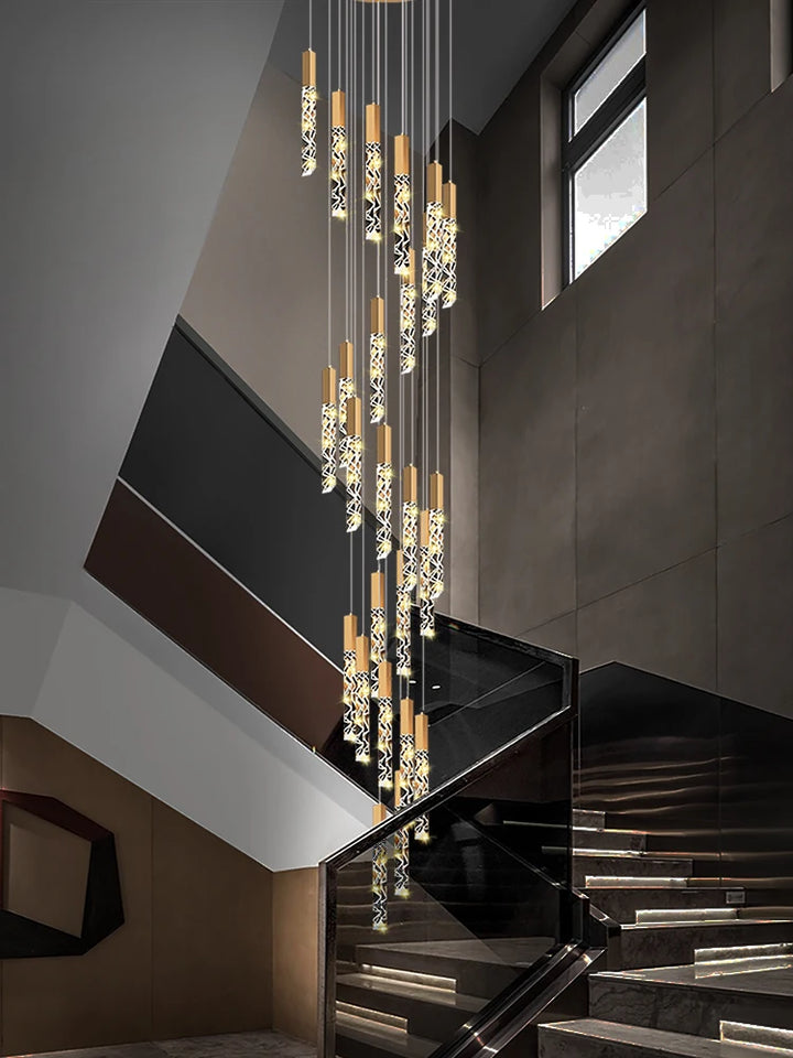 This Crystal Staircase Pendant Lamp is a luxurious modern lighting fixture that adds an opulent touch to any indoor space. Featuring a stunning gold frame and sparkling crystal accents, it creates a dazzling effect, especially when hung in staircases, lofts, or villas. The elegant chandelier design enhances the vertical space, making it a perfect statement piece for dramatic hallways or grand staircases. With its blend of contemporary design and classic luxury, this pendant light illuminates your space beautifully, creating an inviting and sophisticated atmosphere. Ideal for adding glamour and style to any indoor setting.