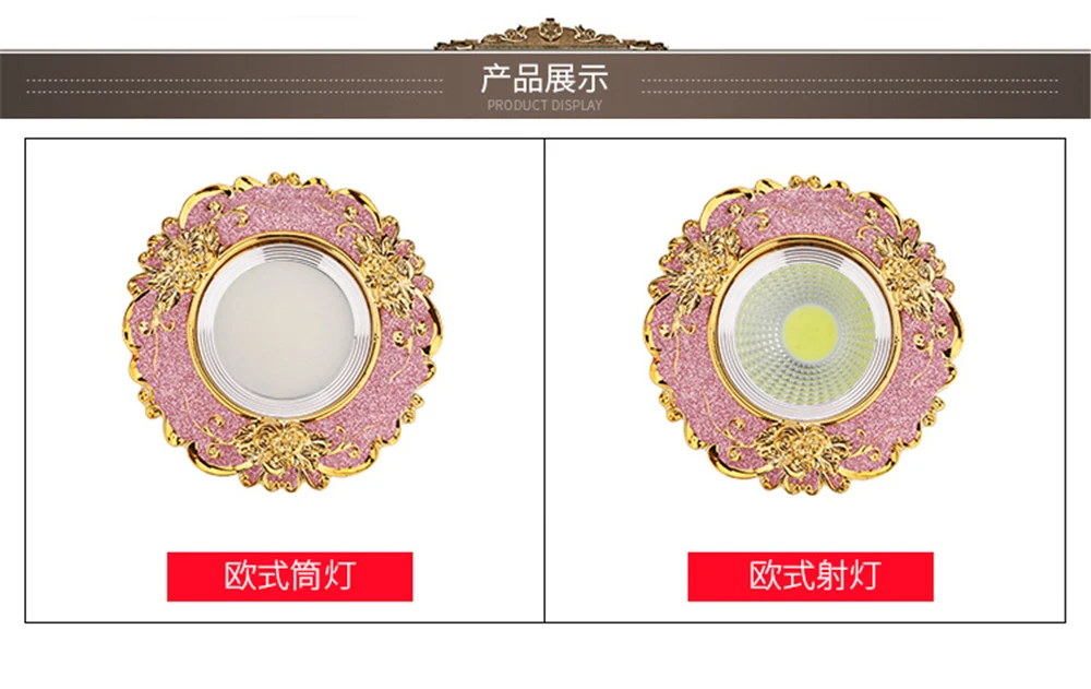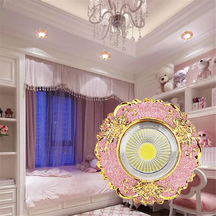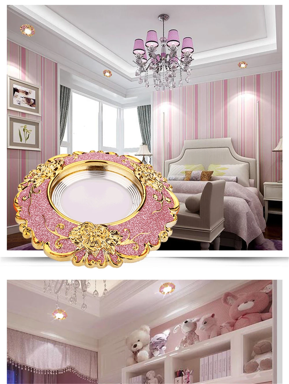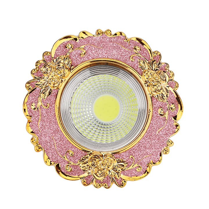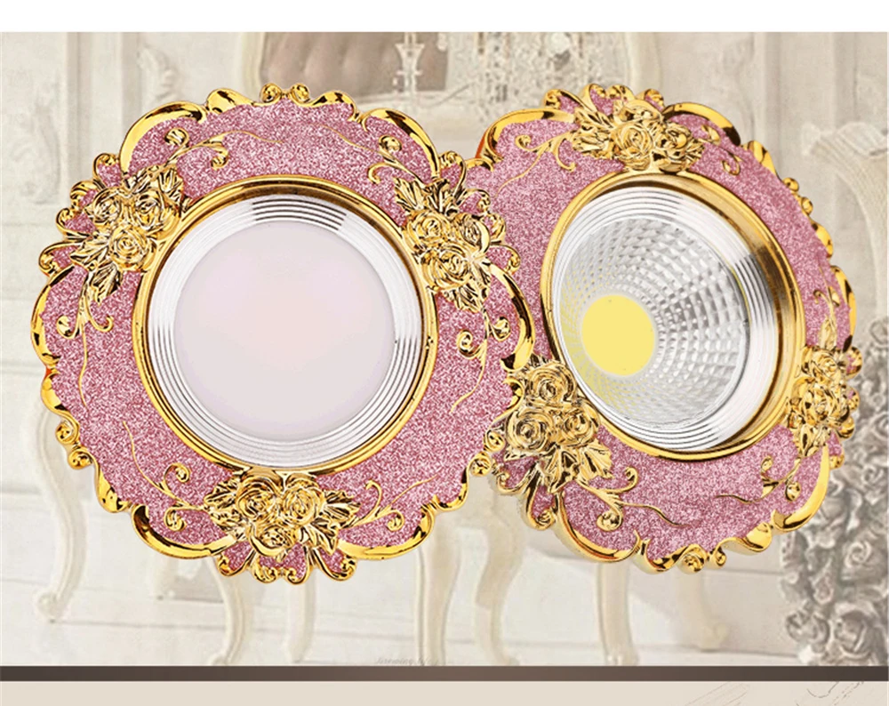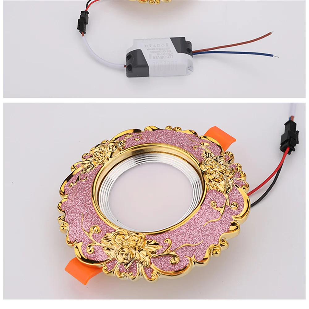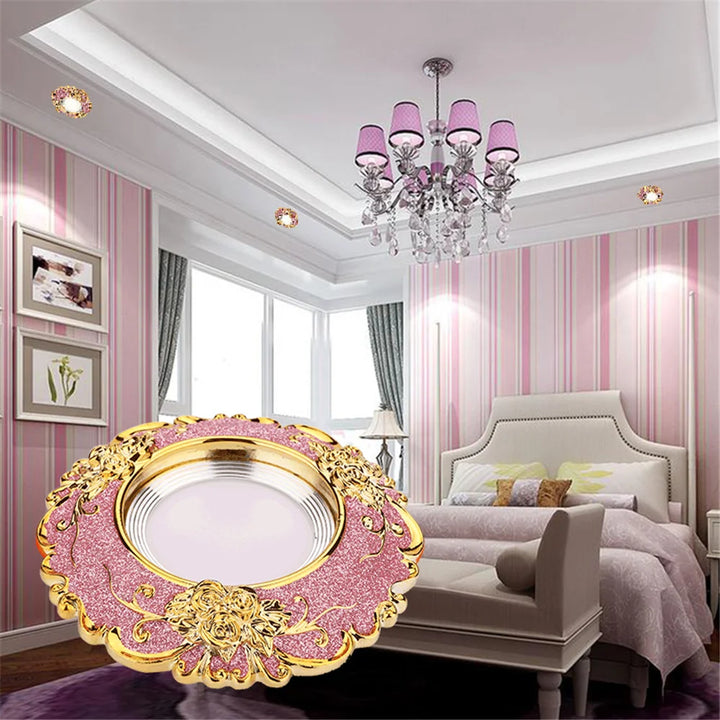 This European luxury pink resin golden lace ceiling lamp adds a touch of opulence to any living room or indoor space. Featuring intricate golden lace detailing, the lamp exudes elegance and sophistication, with a soft pink resin finish that complements both modern and classic decor. Its embedded spotlight design is perfect for accentuating features like a TV background wall or providing focused lighting in your living room. With a 7.5 cm hole for easy installation, this exquisite ceiling lamp creates a luxurious, ambient atmosphere, enhancing the overall aesthetic and setting the perfect mood for any occasion.