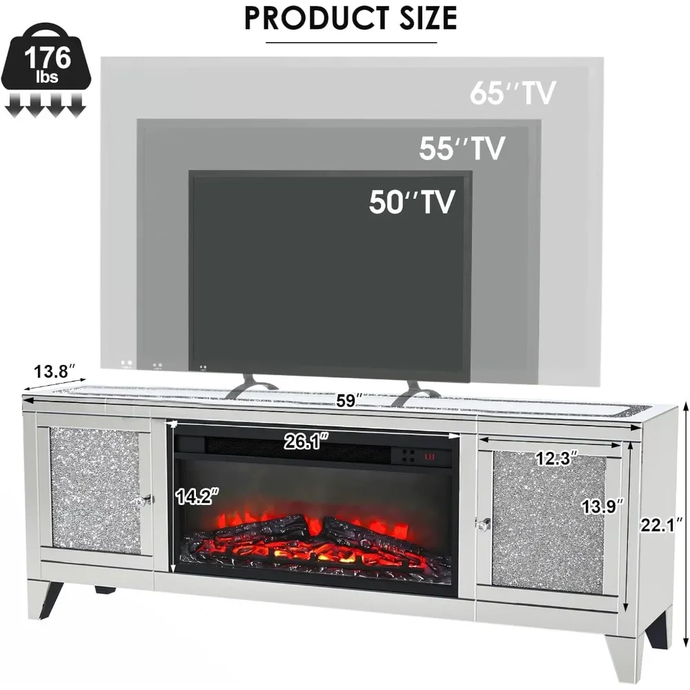 "59" Fireplace TV Stand with Storage – Mirrored Silver Entertainment Center for 65-Inch TVs, Tall TV Stand for Living Room"