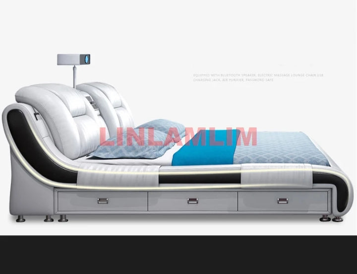 Genuine Leather Multifunctional Bed with Ultimate Massage, Bluetooth Speaker, Air Cleaner, Projector, and Drawers