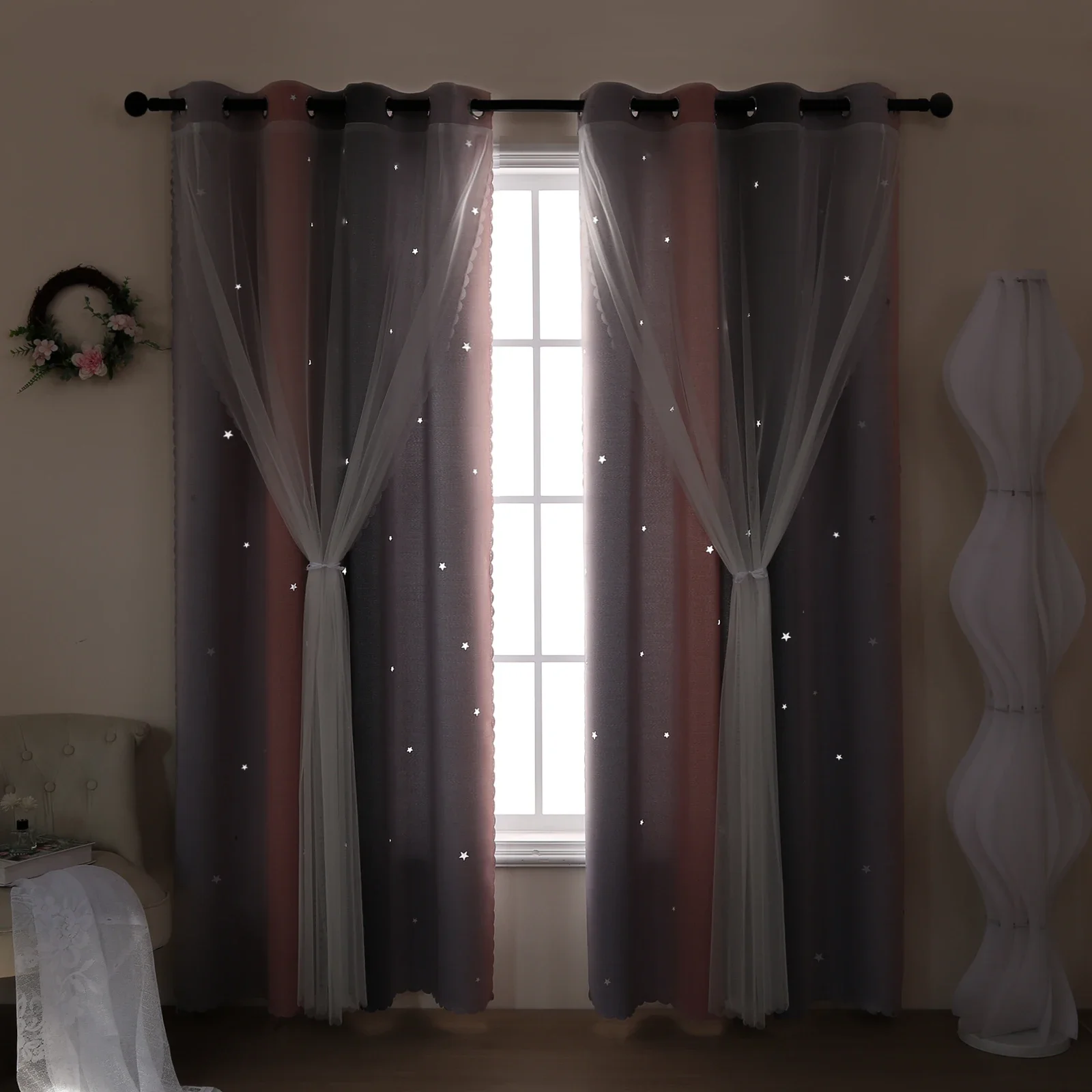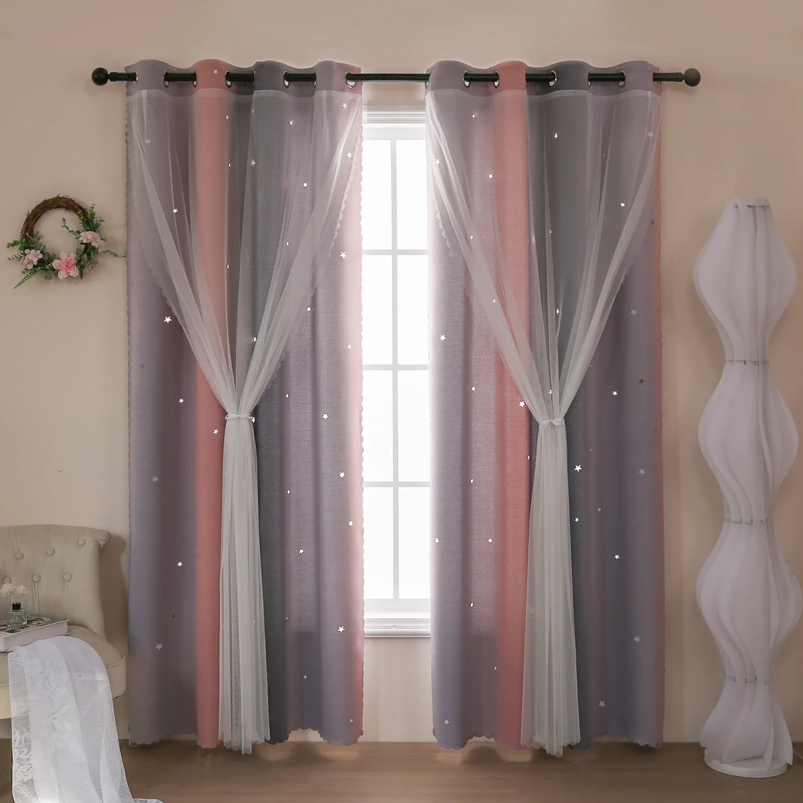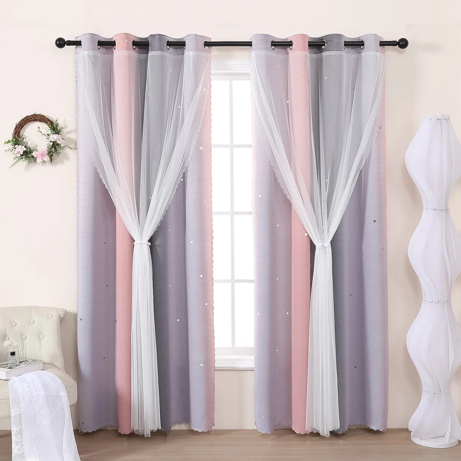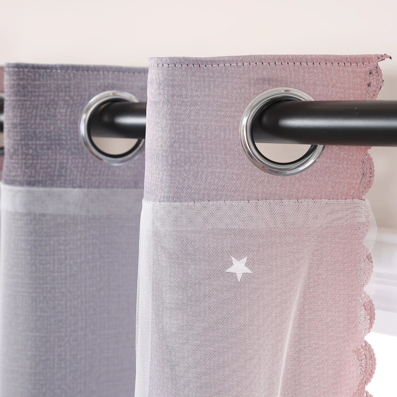 Grey and Pink Gradient Hollow Out Stars Perforated Curtains – Semi-Blackout Decorative Curtains for Girls Bedroom and Living Room