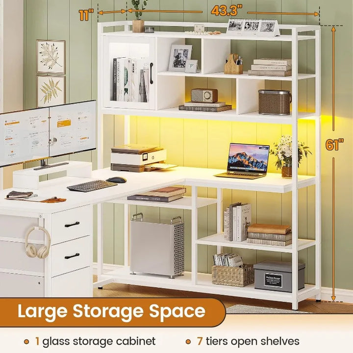 L-Shaped Computer Desk – 58'' Desk with 3 Drawers, Hutch, Storage Shelf, and LED Light