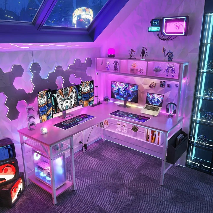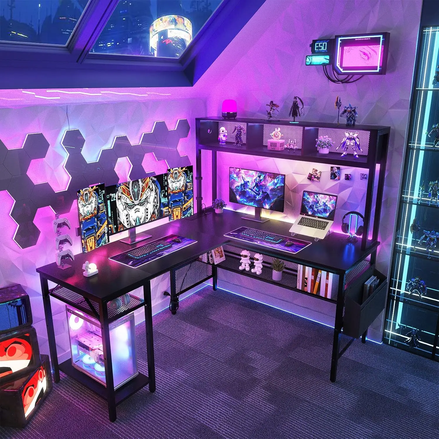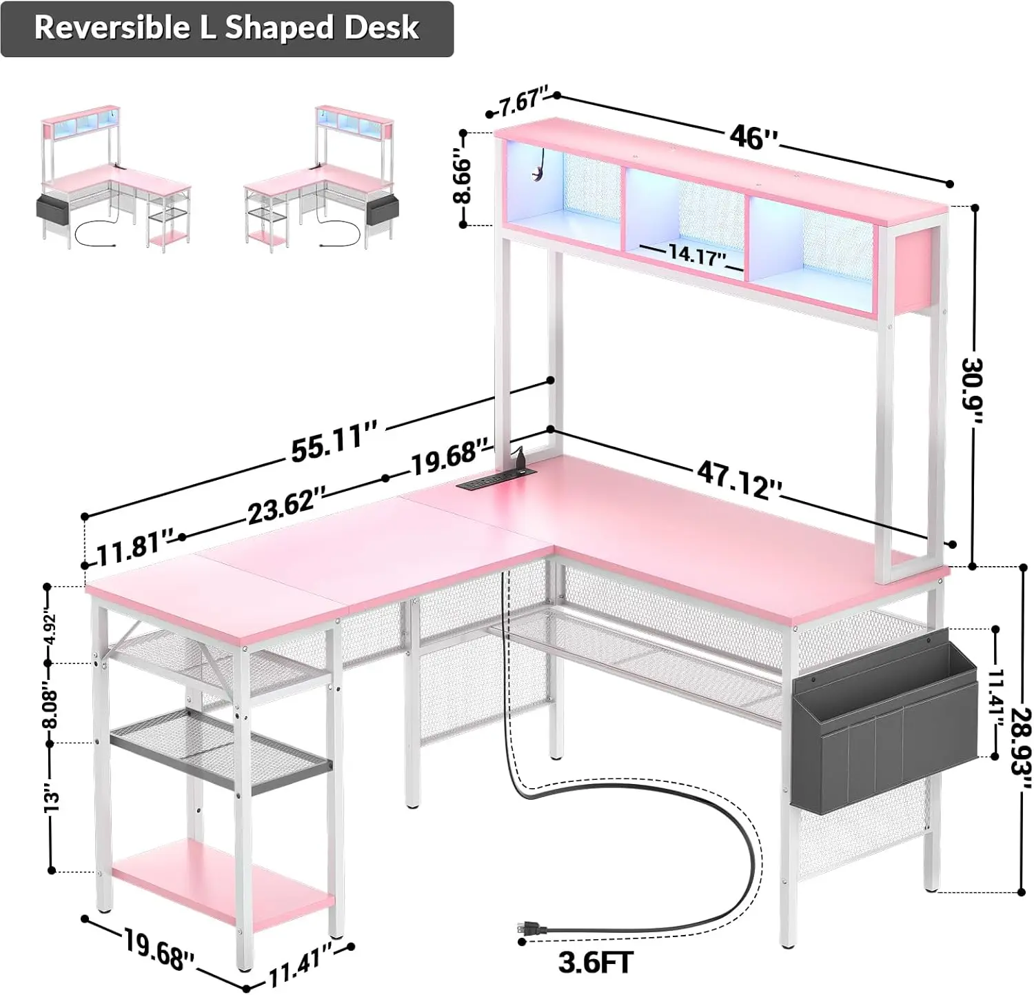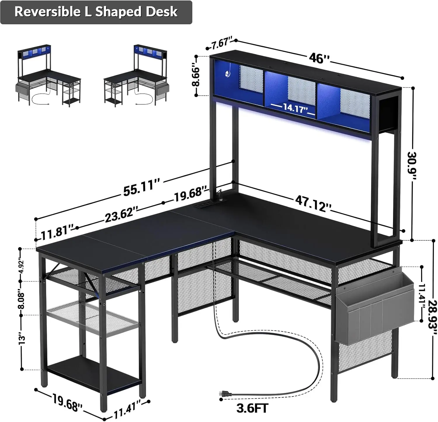 L Shaped Computer Desk – LED Strip and Power Outlets, Reversible L-Shaped Corner Desk with Storage Shelves and Bag