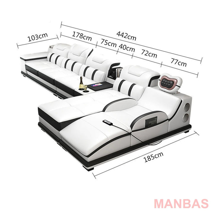 Italian Genuine Leather Sectional Sofa with Bluetooth Speaker, Functional Headrest, Massage Chaise L Shape Corner Sofa