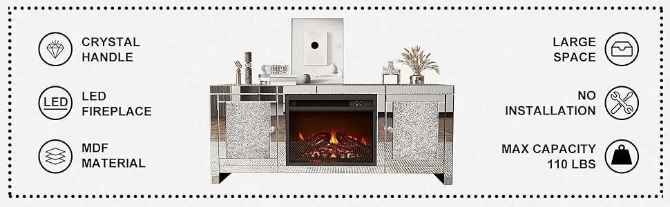 Elevate your living room with this stunning Mirror Fireplace TV Cabinet. Featuring a silver finish and mirrored accents, this elegant piece serves as a beautiful media entertainment center that combines style and functionality. The built-in electric fireplace creates a warm, cozy ambiance with a realistic flame effect, offering both comfort and charm to your space.