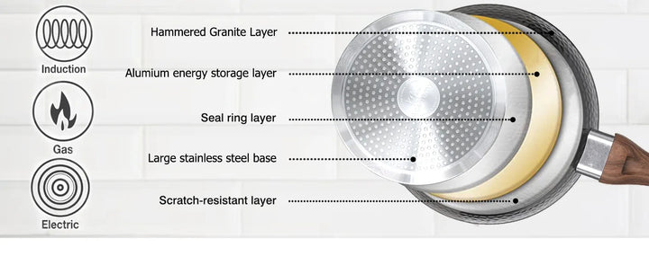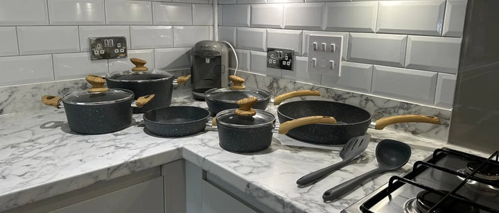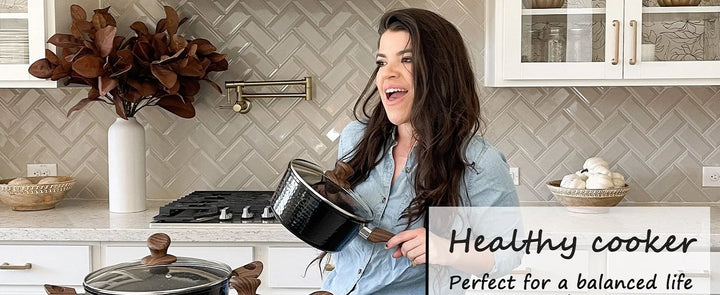 Upgrade your kitchen with the Lockton Premium 10-Piece Cookware Set, featuring nonstick PFA-free ceramic interiors for healthier cooking and easy cleanup. Crafted from heavy-gauge enamel aluminum, this cookware set ensures excellent heat distribution and durability. The set includes a variety of pots and pans designed to meet all your cooking needs, from sautéing to simmering and frying. With a sleek, modern design, this cookware set combines style, safety, and performance, making it perfect for any home chef. Enjoy cooking with confidence, knowing your cookware is both high-quality and eco-friendly.