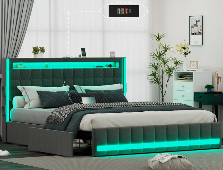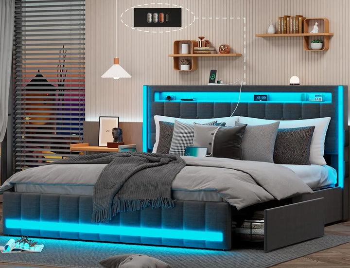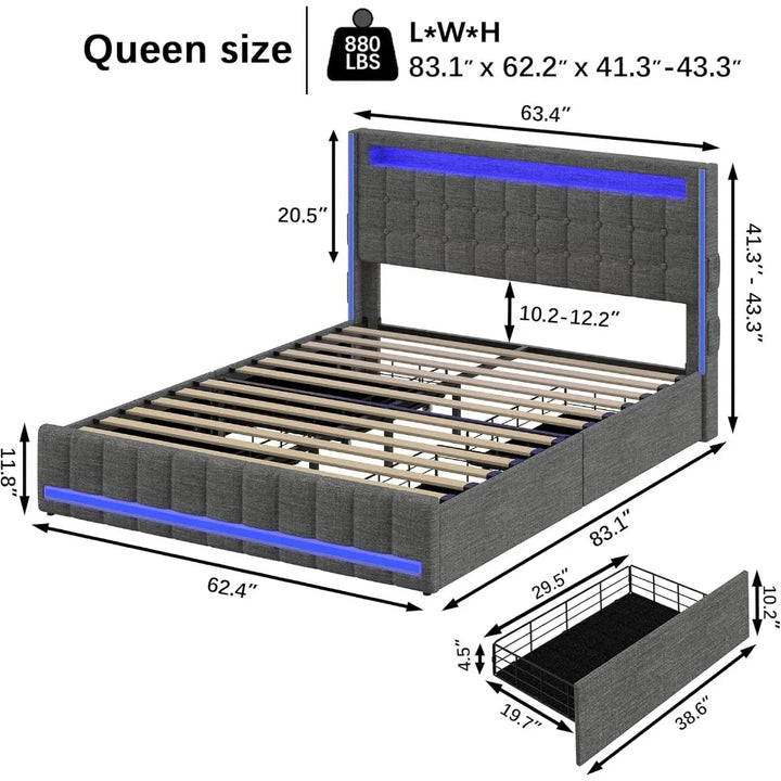 Queen Size Bed with 4 Storage Drawer-LED Lights-Charging Station-Adjustable Headboard-Slats Support-No Box Spring Needed