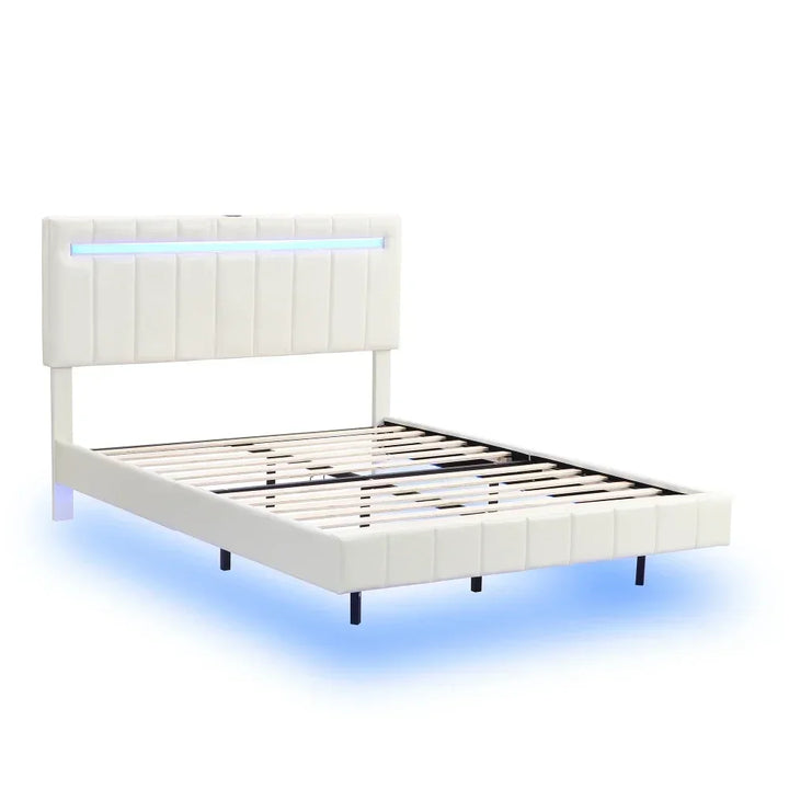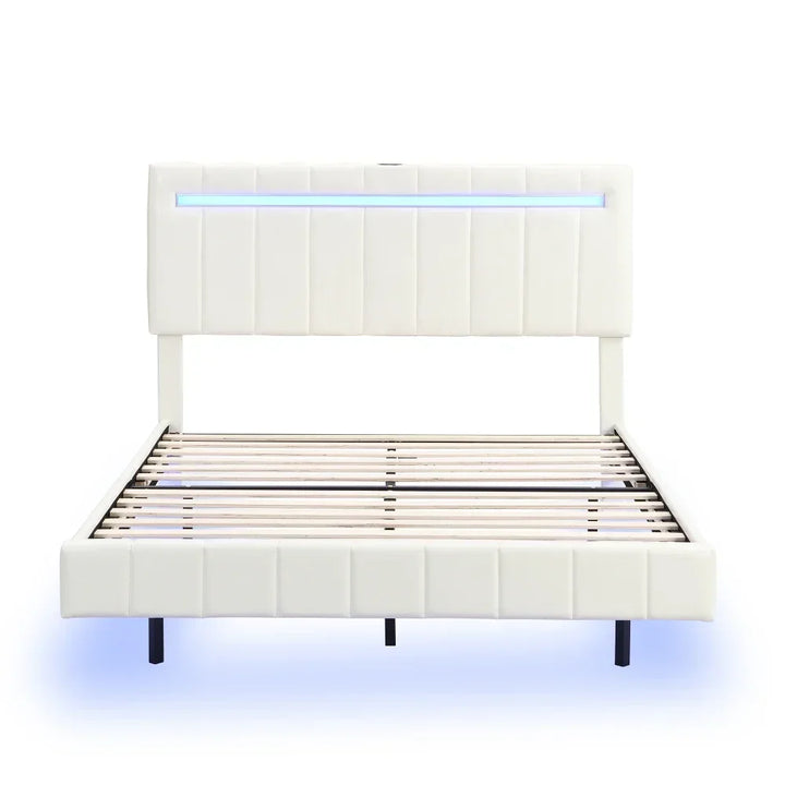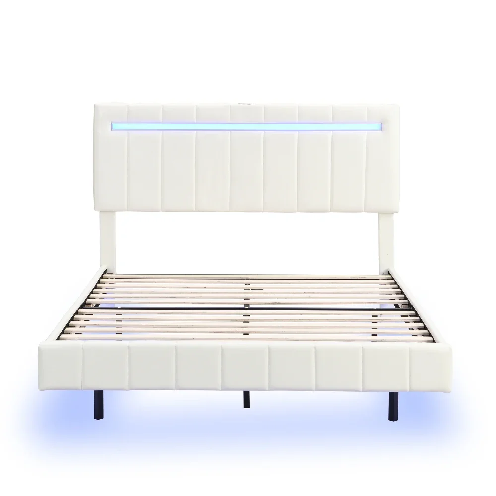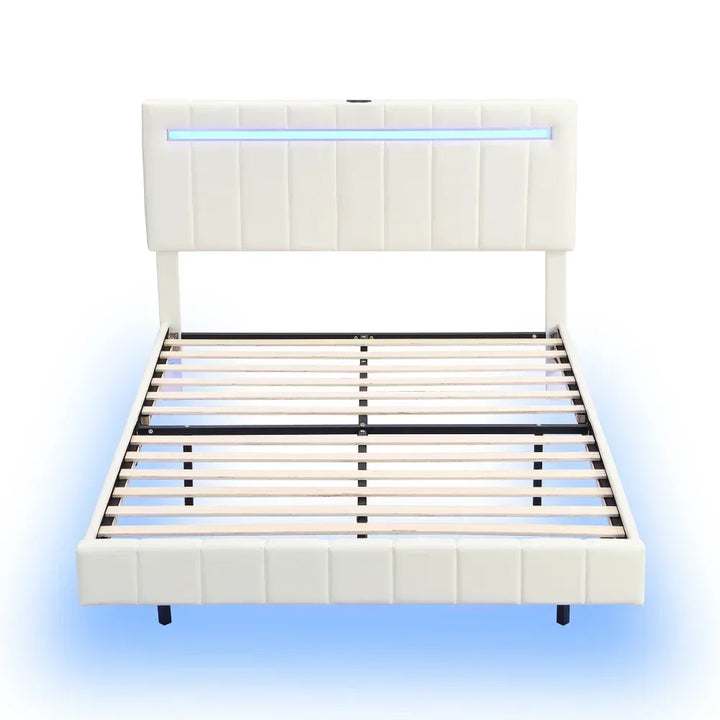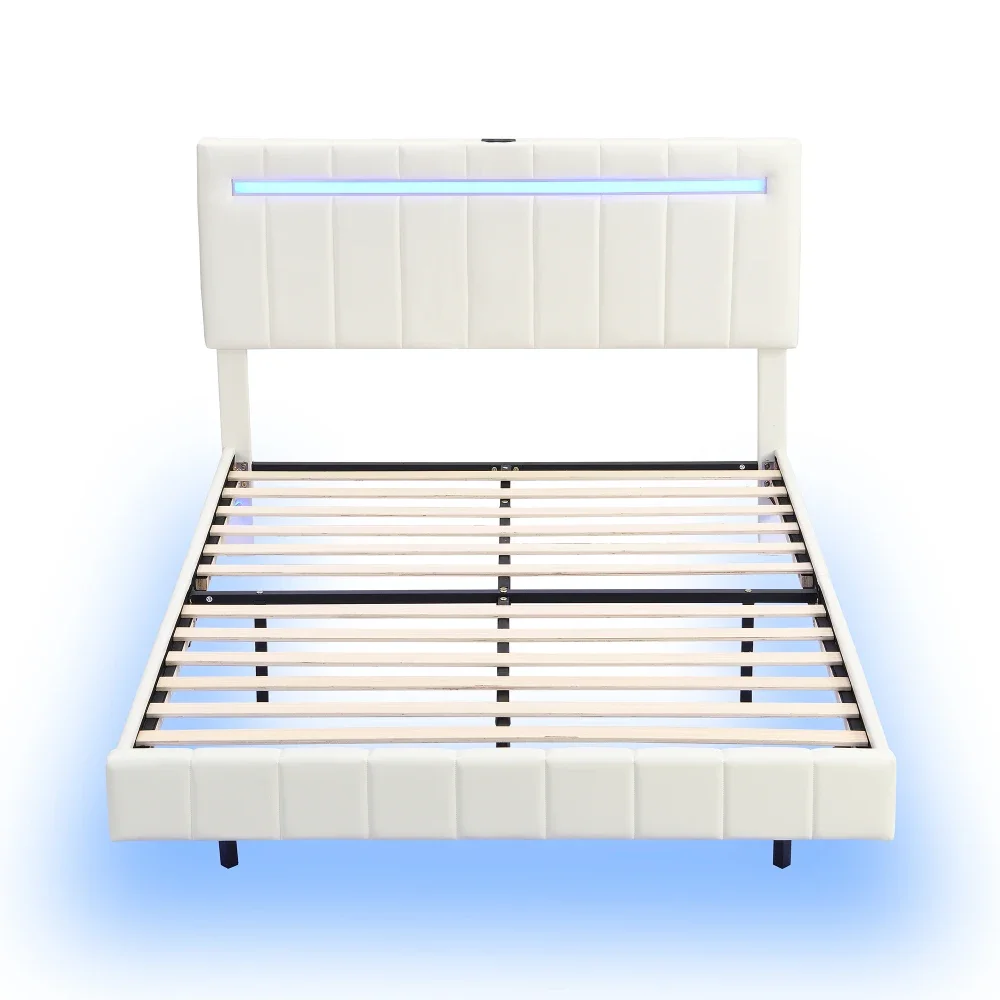 Queen Size Modern Upholstered Platform Floating Bed Frame – LED Lights, USB Charging Ports, No-Noise Design