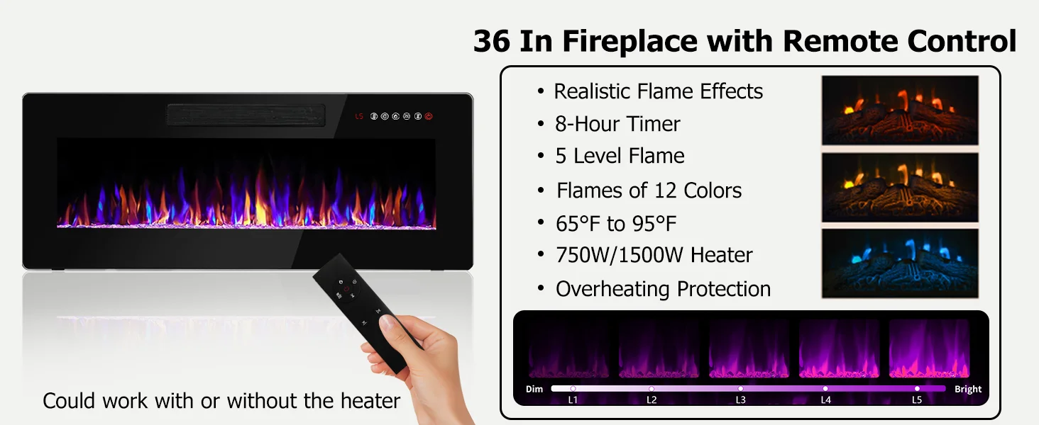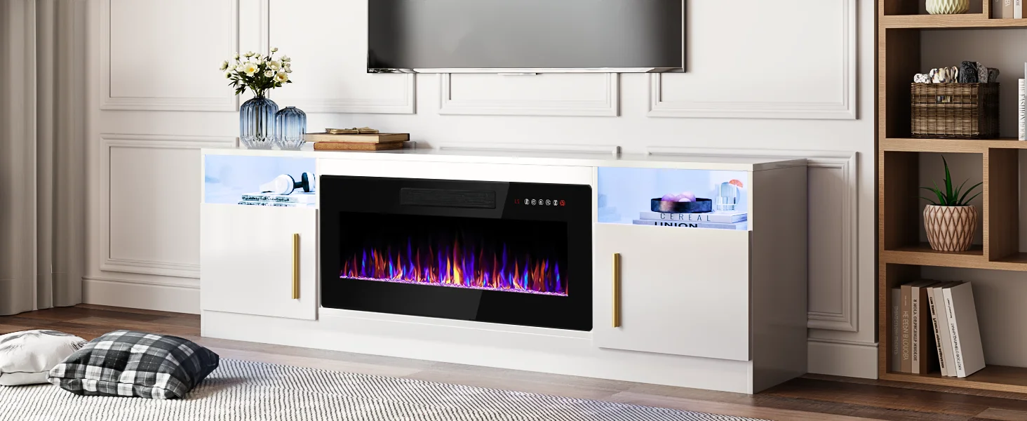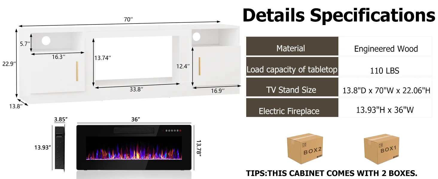 Transform your living room with this stunning 70-inch Modern Wood TV Stand, designed to accommodate up to 80-inch TVs. Featuring a built-in 36-inch electric fireplace, this entertainment center not only provides warmth and comfort but also adds a cozy ambiance to your space with LED light settings. The adjustable LED lights offer multiple color options, allowing you to create the perfect atmosphere for movie nights or relaxation.