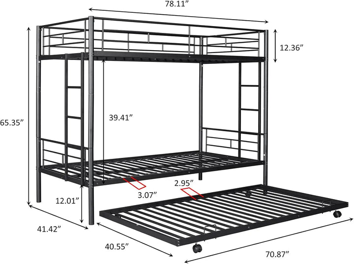 Maximize your space and comfort with the Twin Over Twin Metal Bunk Bed with Trundle, designed to accommodate growing families, guest rooms, or kids' bedrooms. This sturdy heavy-duty metal frame offers reliable support and durability for both top and bottom bunks, ensuring a safe and restful sleep for all users.
