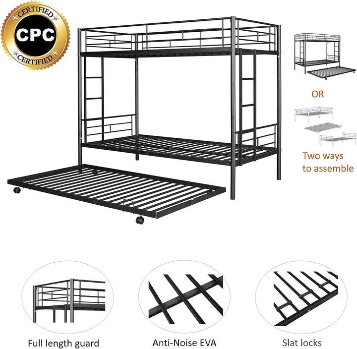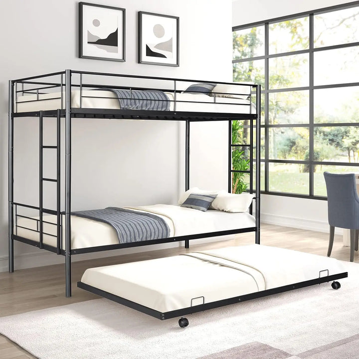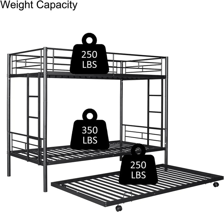 Twin Over Twin Metal Bunk Bed with Trundle – Heavy Duty Frame with 2 Side Ladders